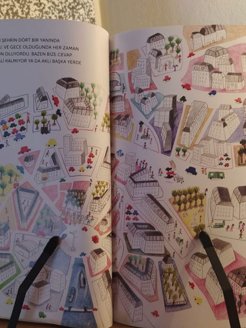 Kitap resimlerle okuma yapılabilsin diye özel bir boyutta basılmış: 23 cm'e 29.5 cm. Selefonlu karton kapak tercih edilmiş. Çizimler kapak içinde karakalem, iç sayfalarda çocuk çizimlerini andıran kuru boya resimlemelere benziyor. Çok ayrıntılı şehir planı, ince ayrıntıları takip etme ve bulma keyfi sunuyor.